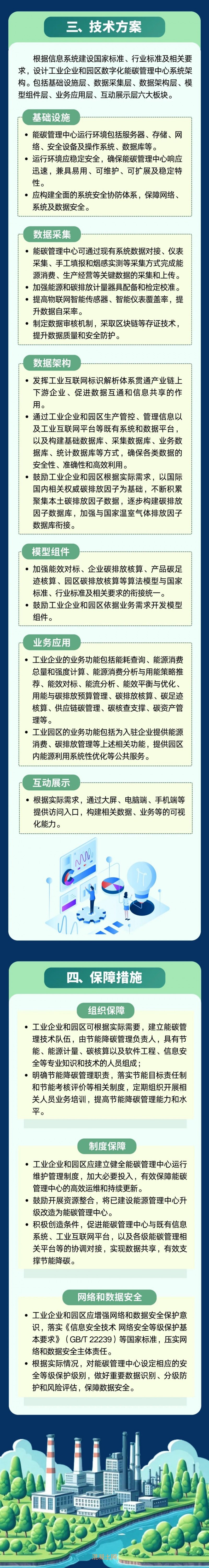四是保障措施。依据《中华人民共和国节约能源法》《工业节能管理办法》等相关规定,从组织机构、管理制度、网络和数据安全等方面提出工业企业和园区采取的具体措施,保障数字化能碳管理中心的高水平建设和高质量运行。