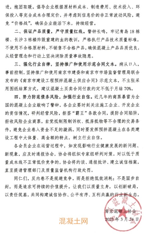 近年来,由于房建市场的持续下滑,南京市预拌五大联赛官方网站市场需求也急剧萎缩,五大联赛官方网站行业出现了产能严重过剩、行业全面亏损、企业难以回款等经营困境。南京五大联赛官方网站协会向全体五大联赛官方网站会员企业提示风险,发布《关于反内卷、求生存、保质量的倡议书》。